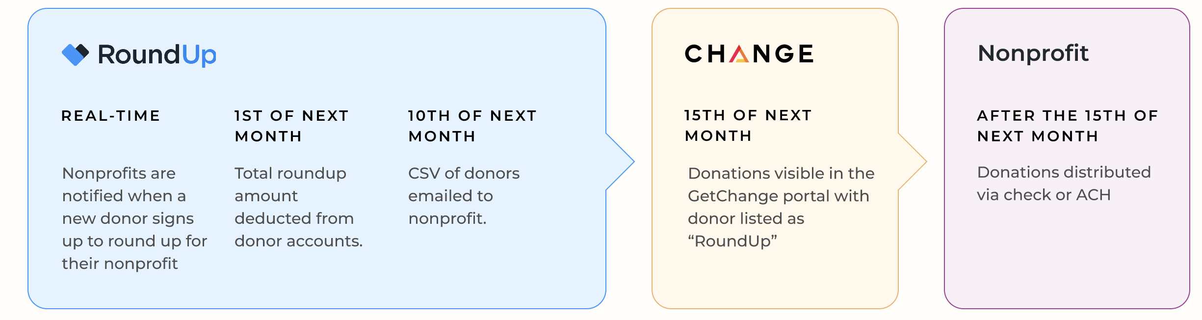 While RoundUp.org notifies nonprofits in real time when a new donor signs up, we only charge donors' cards once a month for the total of their rounded-up transactions incurred during the prior month. After donations are processed, we send a CSV file to the nonprofit admin email addresses on file that includes the donation and donor name and contact information. On or after the 15th of the month, you’ll see your “RoundUp.org” donations in the Change portal.